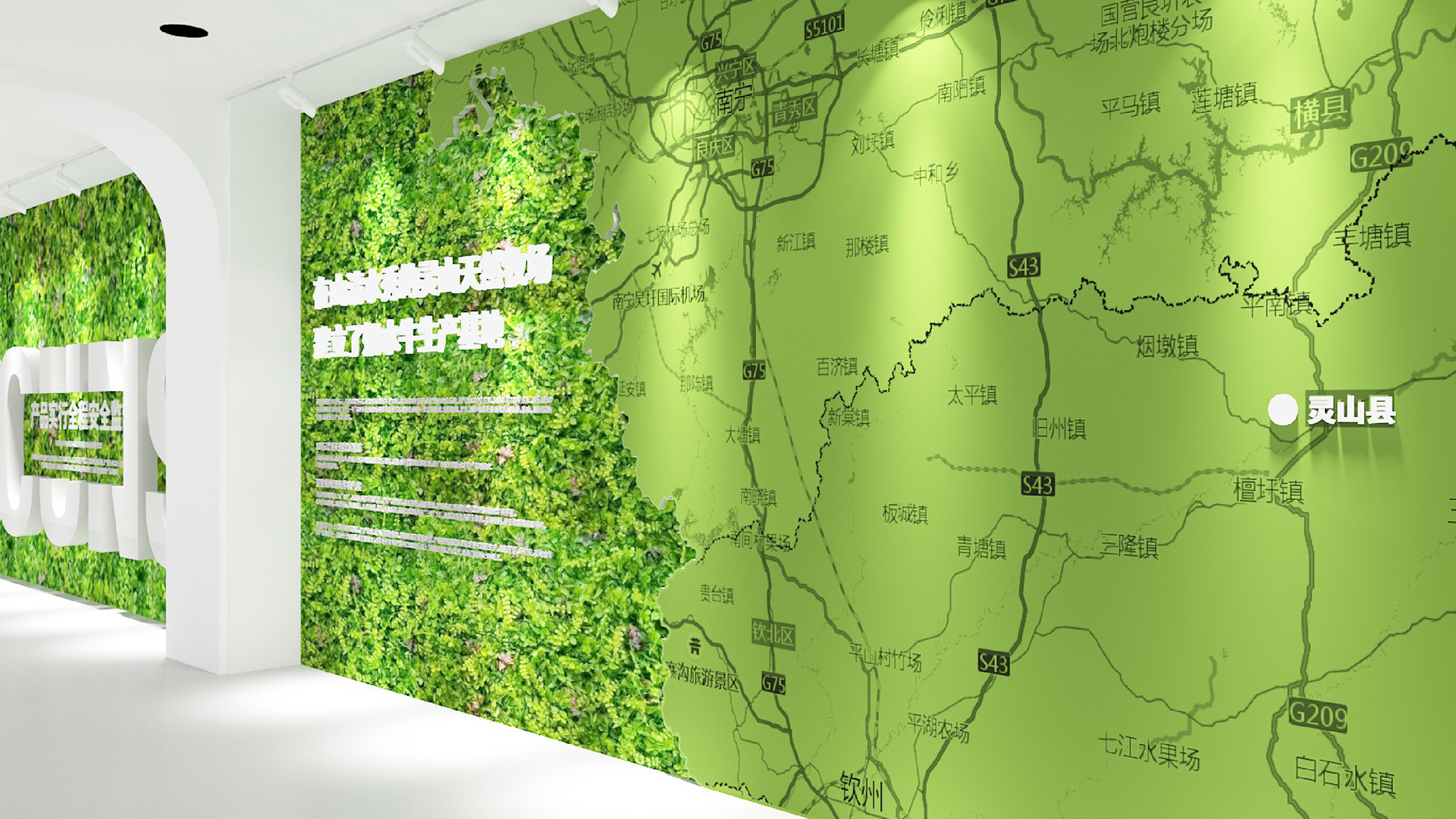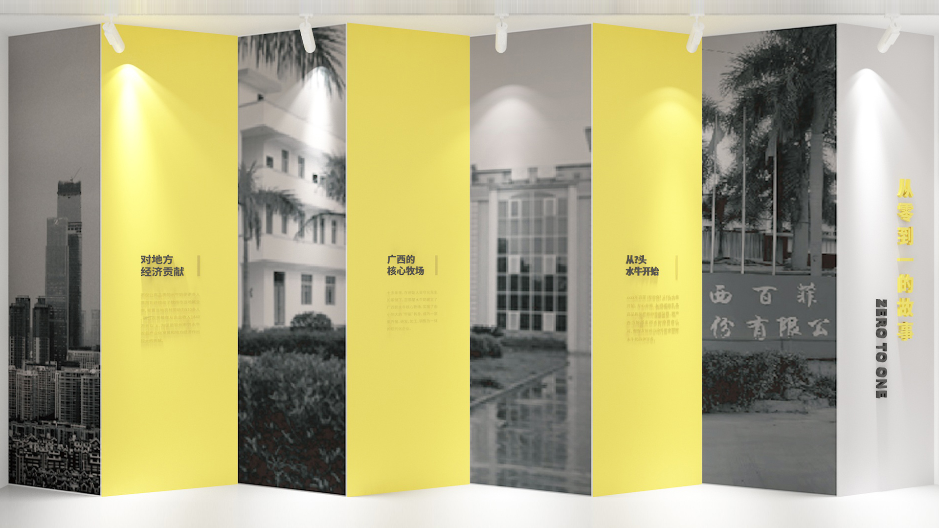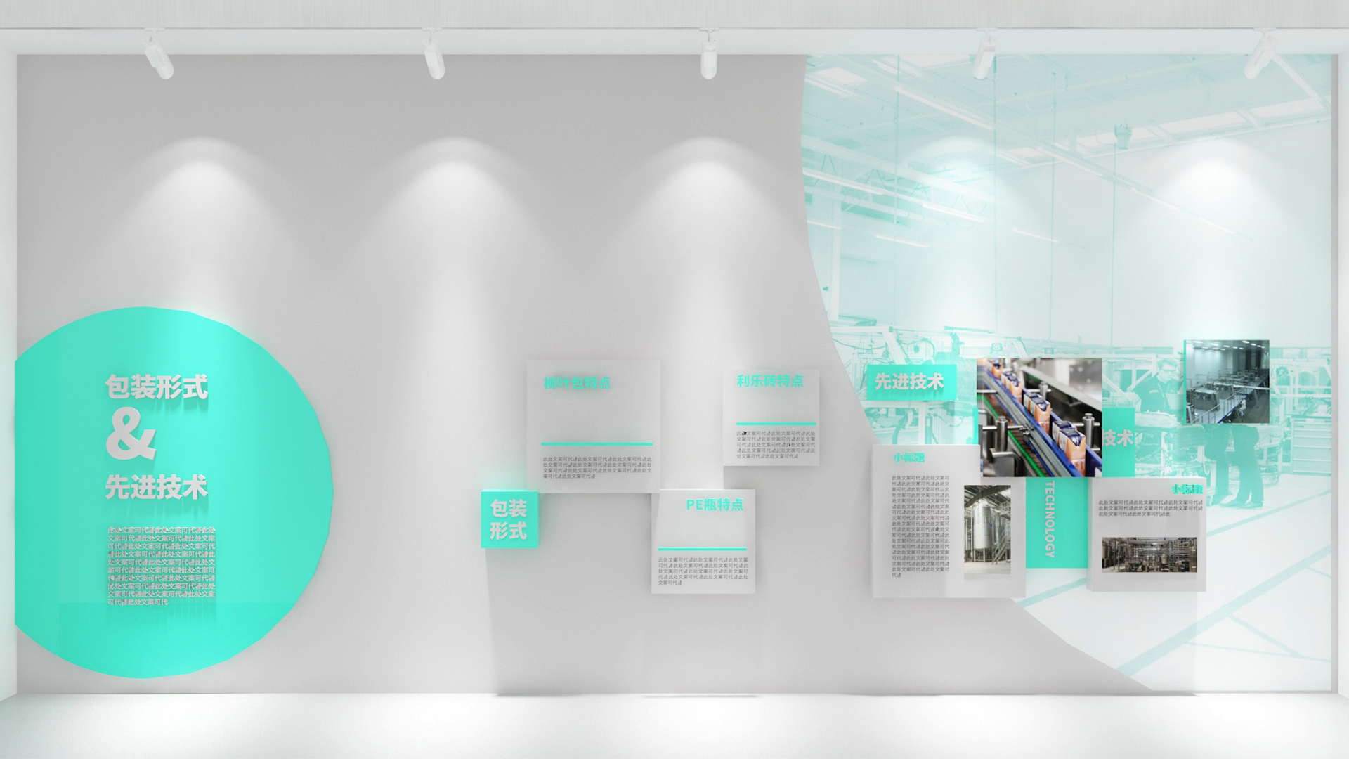 總控室后的玻璃,因為參觀走廊顏色比較豐富,考慮到如果這里也做色彩或者比較復雜的設(shè)計,會造成是視覺混亂,所以我們把這扇玻璃上的遮擋裝飾設(shè)計成和墻面一樣的白色,放上slogan,這樣整體比較統(tǒng)一自然。
